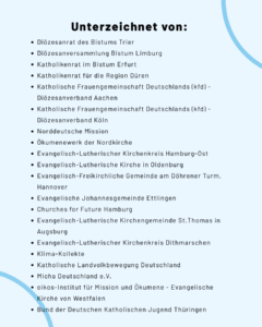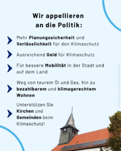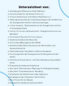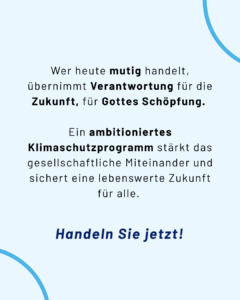 Ein wirksames Klimaschutzprogramm für eine gerechte und lebenswerte Zukunft! Appell von 62 kirchlichen Akteuren an die Bundesregierung für ein wirksames Klimaschutzprogramm Appell_Klimaschutzprogramm_27.11.2025 Sabrina Groppe2025-11-27T14:55:28+01:00
